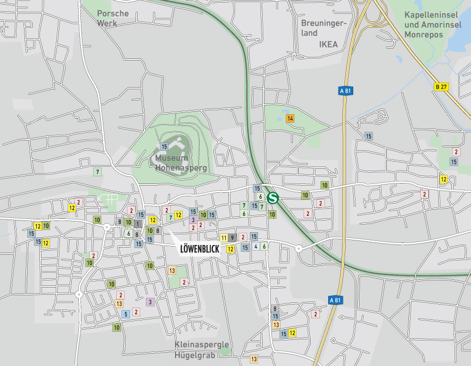 Asperg ist sehr gut mit Einzelhandelsgeschäften und Lebensmittelläden versorgt. Die Stadtmitte ist geprägt von Weiterentwicklung und Erneuerung. Die Geschmäcker sind verschieden – wie auch das zahlreiche Angebot an Gaststätten, Bistros oder Besenwirtschaften, alle laden herzlich zum Genießen und Verweilen ein. Fußgängerfreundliche Entfernungen und die Stärkung des zentrumsnahen Wohnens stehen auf der Agenda des Weinbauortes. Mit der Stadtbücherei, dem Jugendhaus, der Stadthalle und dem Veranstaltungsraum Keltensaal, stehen Räumlichkeiten zur Verfügung, um die Freizeit zu verbringen. Sehenswürdigkeiten und Kultur trifft ein Jeder in Asperg. Die legendäre Schwaben-Bühne sorgt mit ihren Aufführungen nicht nur bei Liebhabern des schwäbischen Mundarttheaters für ausgelassene Freude. Alle, die mehr Theater, Tanz, Musik, Literatur und Wissenschaft erleben wollen, sind beim Verein Glasperlenspiel gut aufgehoben. Museen, historische Bauten und einige schöne Fachwerkhäuser, warten darauf, erkundet und bestaunt zu werden.